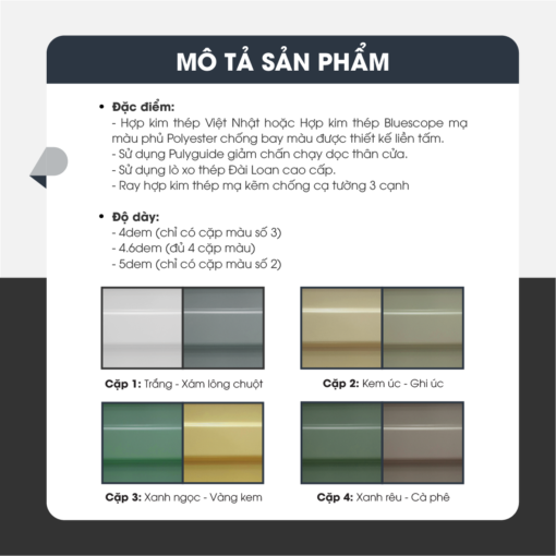 - Thân cửa: Làm từ hợp kim thép Hoa Sen mạ màu và phủ bóng Polyester, có độ dày khoảng 0.5mm, giúp cửa có độ bền cao và khả năng chống ăn mòn tốt.