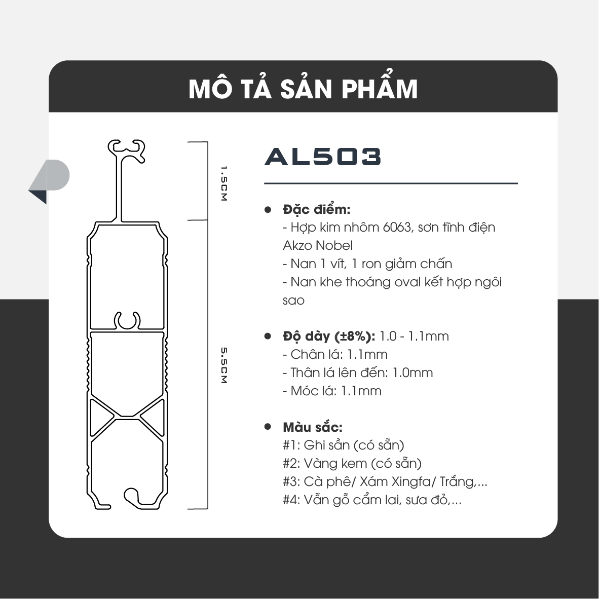 – Hợp kim nhôm 6063, sơn tĩnh điện Akzo Nobel.